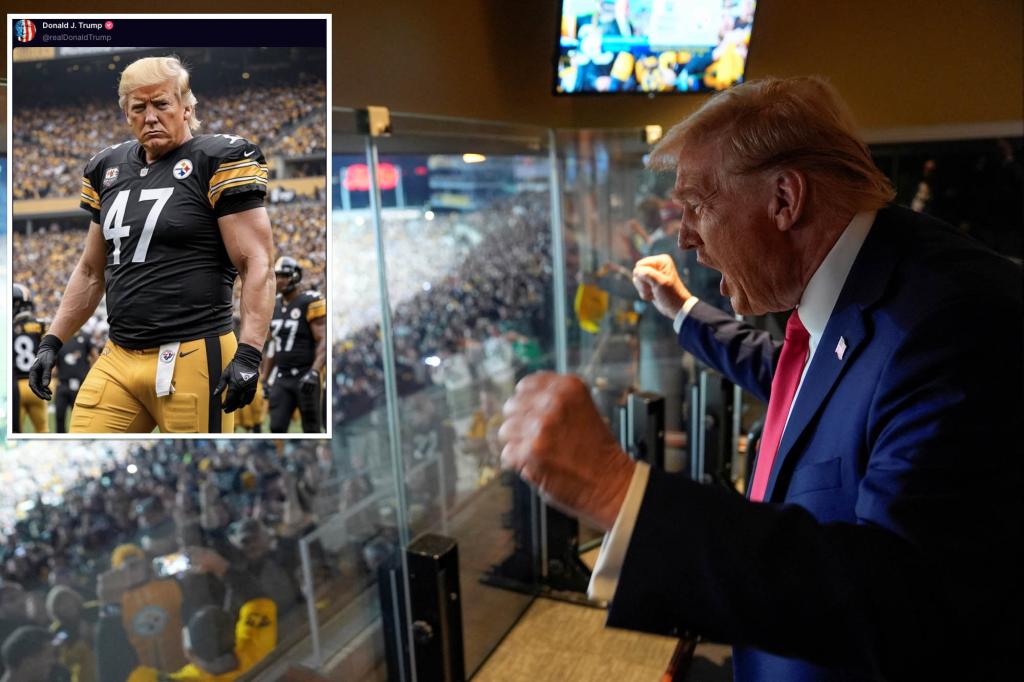 Donald Trump attends Jets-Steelers game and shares photo of himself in Pittsburgh uniform.