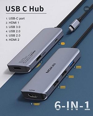 MOKiN offers a high-quality USB C Hub with 2 HDMI ports, 1 USB 3.0 port, and 2 USB 2.0 ports, along with 100W PD support. This 6-in-1 hub allows for easy expansion of work opportunities on Windows laptops, providing stable performance with advanced chip technology. The hub supports SST and MST modes, as well as triple display for Windows laptops (mirror mode only for MacBooks). It enables crystal clear 4K video output at 60Hz on two HDMI ports simultaneously. Additionally, the hub features fast data transfer with USB 3.0 and USB 2.0 ports, allowing for quick file sync and transfer at up to 5Gbps speed. Compatible with various laptop models, this hub is a versatile solution for seamless connectivity and productivity.