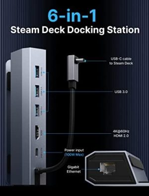 The Steam Deck Accessories Docking Station is a 6-in-1 device that enhances your gaming experience with the Steam Deck and ROG Ally. It includes a 4K@60Hz HDMI output, Gigabit Ethernet input, three USB-A 3.0 ports, and a USB-C port for charging. The docking station supports 100W Max power delivery, allowing for full-speed charging of your devices. It also features gigabit Ethernet for fast online multiplayer gaming and quick file transfers. The docking station is compatible with Steam Deck (OLED), ROG Ally, iPads, and Android phones with USB-C ports. Please note that it is not compatible with the AYANEO console. Enhance your gaming setup with the Steam Deck Accessories Docking Station for a smoother and more immersive gaming experience.