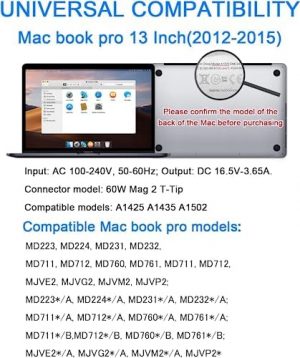 The MacBook Pro charger is made of advanced materials with a PC fireproof shell and a magnetic connector for safe disconnection. It has an input of AC 100-240V and an output of DC 14.85V-3.05A, with a power of 60W and a T-Tip style. The charger features LED lights that indicate the charging status, with orange for charging and green for a full charge. It has built-in security features with smart chips to prevent overcharging. The folding plug design makes it convenient for travel. It is compatible with MacBook Pro 13-inch with Retina display models from 2012 onwards, as well as MacBook Air 11-inch and 13.3-inch models. The charger also comes with 24-hour online customer service for any issues.