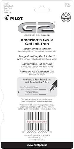 The Pilot G2 Gel Roller pens offer a smooth writing experience with long-lasting ink that comes in a variety of colors and 4 tip sizes. The quick-drying ink prevents smudging and smearing, ensuring neat and clear work. These pens are perfect for everyday writing tasks and are refillable, saving you money and reducing waste. The contoured rubber grip provides ergonomic support, reducing hand fatigue during lengthy writing projects. The archival-safe and acid-free black ink is fade-resistant, ensuring your documents last for a long time. The Pilot G2 line blends smooth writing with long-lasting ink, precision, and comfort, providing an exceptional writing experience for all your writing and drawing needs. Express yourself effortlessly with Pilot’s innovative line of writing tools.