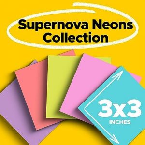 The Post-it Super Sticky Notes Supernova Neons Collection features vibrant electric colors that are perfect for jotting down daily tasks, brainstorming, studying, and setting reminders. These sticky notes have 2X the sticking power and can be easily moved around without leaving any residue. They are ideal for vertical surfaces like walls, doors, and windows, and come in a pack of 24 pads with 70 sheets per pad. The colorful notes are part of the Supernova Neons collection and are sourced from certified, renewable forests. These sticky notes are perfect for shopping lists, reminders, color-coding, labeling, brainstorming, and more. With a variety of sizes and shapes available, Post-it Super Sticky Notes are a versatile and essential tool for any office, work area, or classroom.