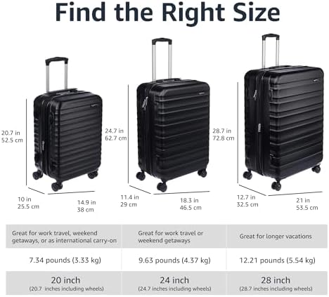 This 20″ spinner suitcase from Amazon Basics is designed for efficient and convenient travel. It meets carry-on restrictions for both domestic and international flights, and has an expandable design that provides up to 15% more packing capacity. The suitcase is made from extra-thick ABS hard shell with a scratch-resistant finish, ensuring durability and strength. It has a fully lined interior for added protection, with an interior organizer featuring dividers and three zippered pockets for small items. Maneuvering through airports is easy with four multi-directional double spinner wheels and a telescoping handle. The overall dimensions are 13.58 x 9.45 x 20.87 inches, making it a compact and practical option for any traveler.