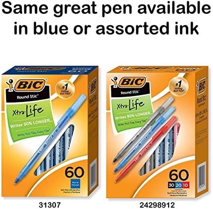 The BIC Round Stic Xtra Life Ballpoint Pens are a reliable and affordable option for daily use at home, school, or the office. These pens offer long-lasting performance, writing 90% longer on average than the Paper Mate Ink Joy 100 Ball Stick Pen. With a versatile 1.0 mm medium point, these pens create vivid lines and have a reliable tungsten carbide ball point for smooth and even ink distribution. The flexible round barrel provides writing comfort, while the translucent barrel allows you to monitor the remaining ink supply. These non-refillable pens are available in black, blue, and red ink. BIC Round Stic Xtra Life Ballpoint Pens are the #1 selling ball pen in the US and do not have any affiliation with Newell, the maker of Paper Mate and Ink Joy pens.