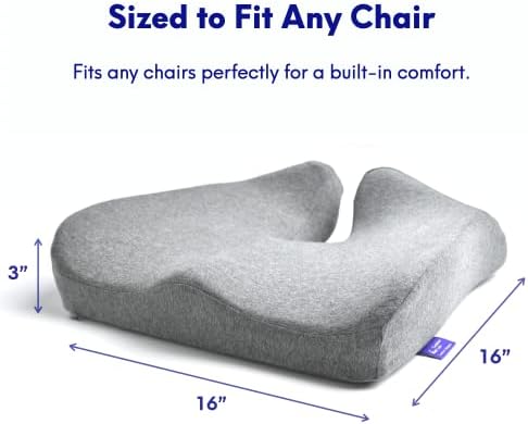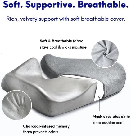 The Pressure Relief Seat Cushion is designed by ergonomists to provide comfort and support while sitting for extended periods of time. The unique split design helps distribute weight evenly and reduce lower back pressure. The cushion has a grippy bottom to prevent slipping and pairs perfectly with the Back Relief Lumbar Pillow for ultimate comfort. The cushion encourages proper posture and redistributes lower body weight for comfort during long hours of sitting. The extra-dense charcoal memory foam offers soft support and remains odor-free. It is ideal for working from home, driving, or wheelchair usage. The cushion is backed by a satisfaction guarantee and is driver-tested for comfort during long drives. Take the weight off your tailbone and lower back with the Pressure Relief Seat Cushion for enhanced comfort and support.