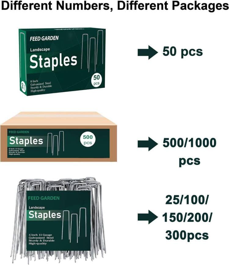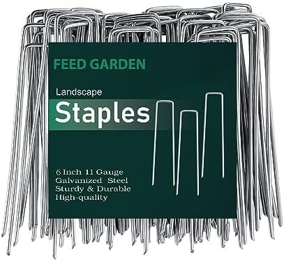 The product is a set of landscape fabric staples made of heavy-duty hot-dip galvanized steel that are durable and reusable. The 6-inch long stakes have sharp ends for easy penetration into various surfaces like sod, plastic sheeting, and heavy soil. They can be used to secure landscape fabric, garden hoses, Christmas lights, and more. The package includes 50 stakes and they are available in different sizes and quantities. The stakes are suitable for various outdoor activities and can be used to fix edging, plant roots, weed barriers, and fences. The brand, FEED GARDEN, offers quality products and efficient after-sales service. If customers are not satisfied, they can contact the company for a solution.