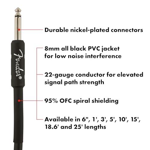 The Fender Professional Series Instrument Cable is a road-reliable and flexible guitar cord that boasts a thick gauge and high-quality components to transparently retain your tone. With quiet and resilient spiral shielding, these guitar cables are engineered to avoid twisting and kinking, providing a reliable performance on stage or in the studio. Featuring a 95% oxygen-free spiral shielding, an 8mm PVC jacket, a 22 gauge conductor, and sturdy nickel-plated connectors, these cables offer elevated signal path strength and low noise interference. The 10-foot cable is durable, flexible, and helps eliminate handling noise for a crisp, clean sound. Backed by a limited lifetime warranty, this Fender instrument cable is a trusted choice for musicians seeking reliable performance and creative confidence.