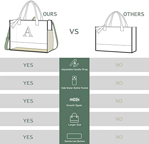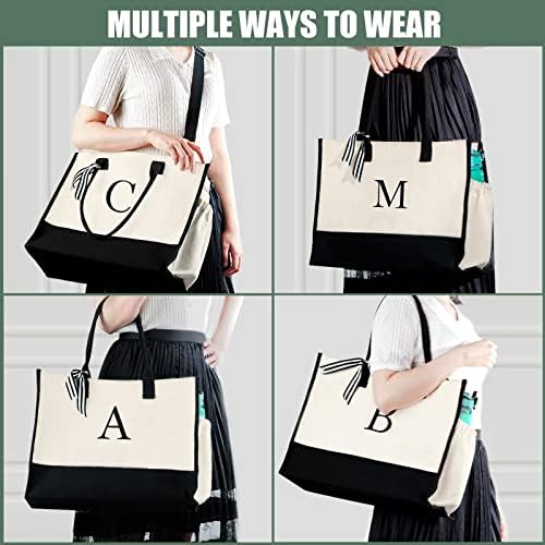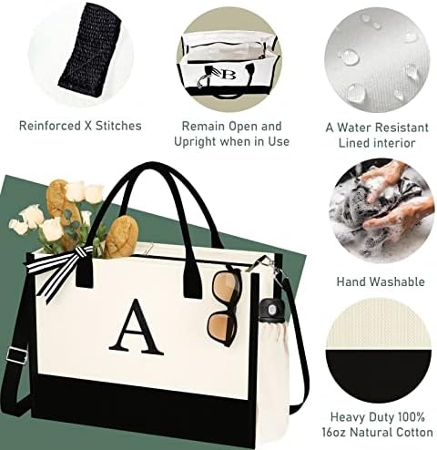 Initial Canvas Beach Tote Bag with Zipper Pockets Birthday Gifts for Women, Personalized Monogrammed Strap, Reusable Grocery Bags – Wedding Bride Bridemaids Friend Letter A
