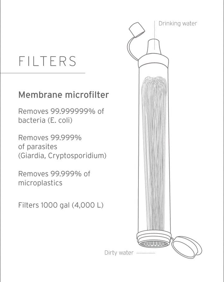 The LifeStraw Personal Water Filter is a must-have for hiking, camping, travel, and emergency preparedness. It removes 99.999999% of waterborne bacteria, including E. coli and Salmonella, and 99.999% of waterborne parasites, such as Giardia and Cryptosporidium. Additionally, it filters out microplastics down to 1 micron in size and reduces turbidity down to 0.2 microns. The claims of this product are verified by laboratories using standard testing protocols set by the US EPA, NSF, and ASTM for water purifiers. With proper use and maintenance, the microbiological filter can provide 4,000 liters (1,000 gallons) of clean and safe drinking water. Furthermore, for every LifeStraw product purchased, a school child in need receives safe drinking water for an entire school year. This product is made of BPA-free materials.