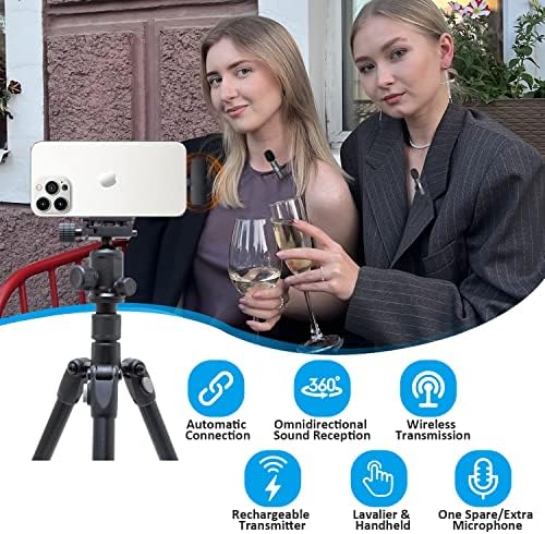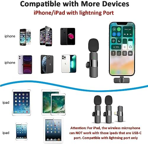 The product is an easy-to-use wireless lavalier microphone system that automatically connects without the need for adapters, Bluetooth, or applications. It has omnidirectional sound reception with noise reduction technology and is compatible with iOS smartphones and iPads. The microphone is suitable for content creators, interviewers, online conferencing, podcasting, vlogging, and live streaming. The wireless system has a range of 50ft and is ideal for recording indoors or outdoors without the hassle of wires. The transmitter and receiver are rechargeable, with up to 4.5 hours of operation time and a quick two-hour charging time. Please note that the microphone is only compatible with devices with a Lightning port and does not work with devices that have a USB-C port, such as the iPhone 15 or iPad Pro series. Make sure to turn off Bluetooth on your device before using the microphone.