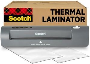 The Scotch Thermal Laminator is a professional-quality machine that can laminate items up to 9 inches wide with a 2 roller system and two temperature settings. It can laminate up to 5 mil thickness pouches, creating bubble- and wrinkle-free results. Ideal for protecting frequently used documents, this laminator is perfect for creating marker-proof, tear-proof, and spill-proof paper items. It can laminate one letter-size page per minute and has a release lever for quick pouch release. This compact laminator is photo safe and accepts both 3 mil and 5-mil pouches. It is perfect for use in the home office, for holiday and school supplies, and for creating holiday signs, banners, gift tags, artwork, and place cards. Each package contains one Scotch Thermal Laminator and is great for quick fixes, mounting, or additions to your projects.