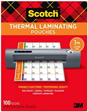 The Scotch Thermal Laminating Pouches are designed to protect frequently handled documents with a clear, professional and photo-safe finish. These pouches are ideal for use with thermal laminators and can accommodate items up to 8.5″x11″. The pack includes 100 pouches, making it suitable for a variety of projects at home, in the office, or in the classroom. The pouches provide protection for children’s artwork, signs, flyers, schedules, certificates, and other important documents. They are marker-proof, tear-proof, and spill-proof, ensuring that your items last longer. However, it is important to note that the laminating pouches are not recommended for use with currency, Social Security cards, stamps, credit cards, or items with magnetic strips. It is highly encouraged to use these pouches with Scotch Thermal Laminators for optimal results.