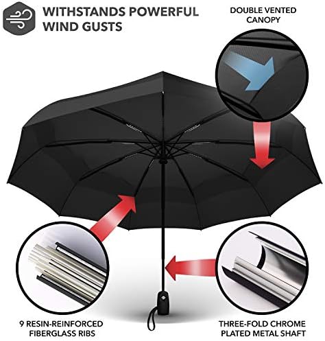 The Repel black travel umbrella is a compact and lightweight option for ultimate protection and comfort in any weather condition. With a length of just 11.5 inches and weighing less than a pound, it can easily be stored in bags or backpacks. The umbrella is fortified with 9 resin-reinforced fiberglass ribs to withstand powerful gusts without turning inside out. It features a double-vented and Teflon-coated canopy that allows wind through the top while keeping water out. The waterproof and windproof canopy ensures long-lasting protection against the elements. This high-quality umbrella is designed for durability, making it a reliable partner in the face of challenging weather conditions.