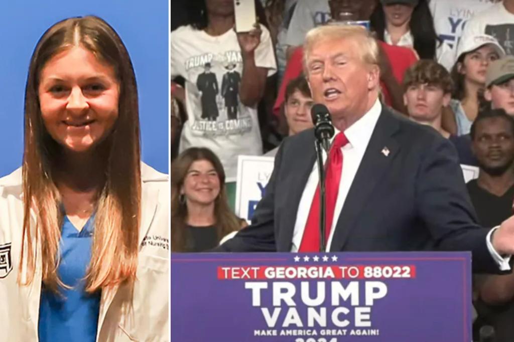 Trump accuses Harris of responsibility for Laken Riley’s murder by an illegal migrant.
