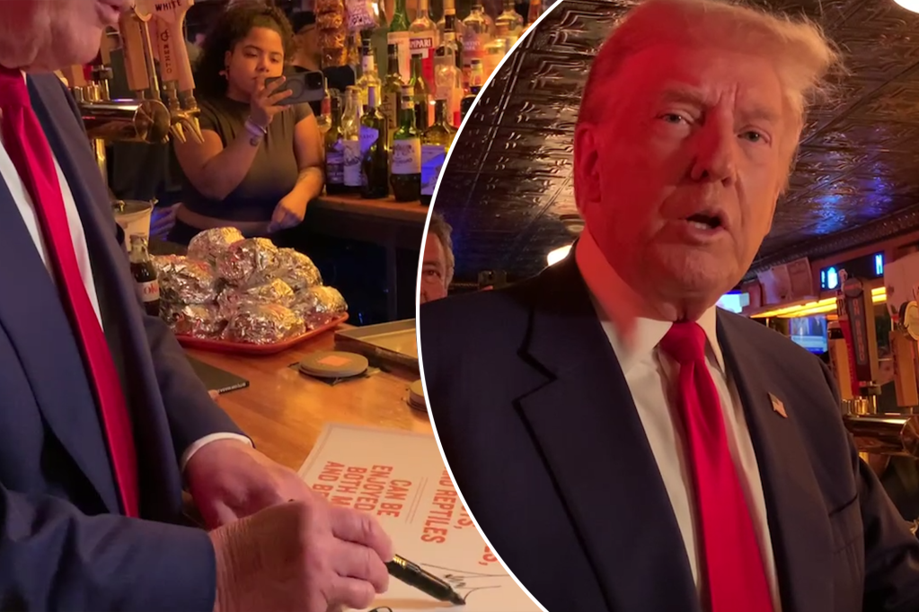 Trump talks about safety and security while giving out burgers at a Bitcoin bar in NYC.